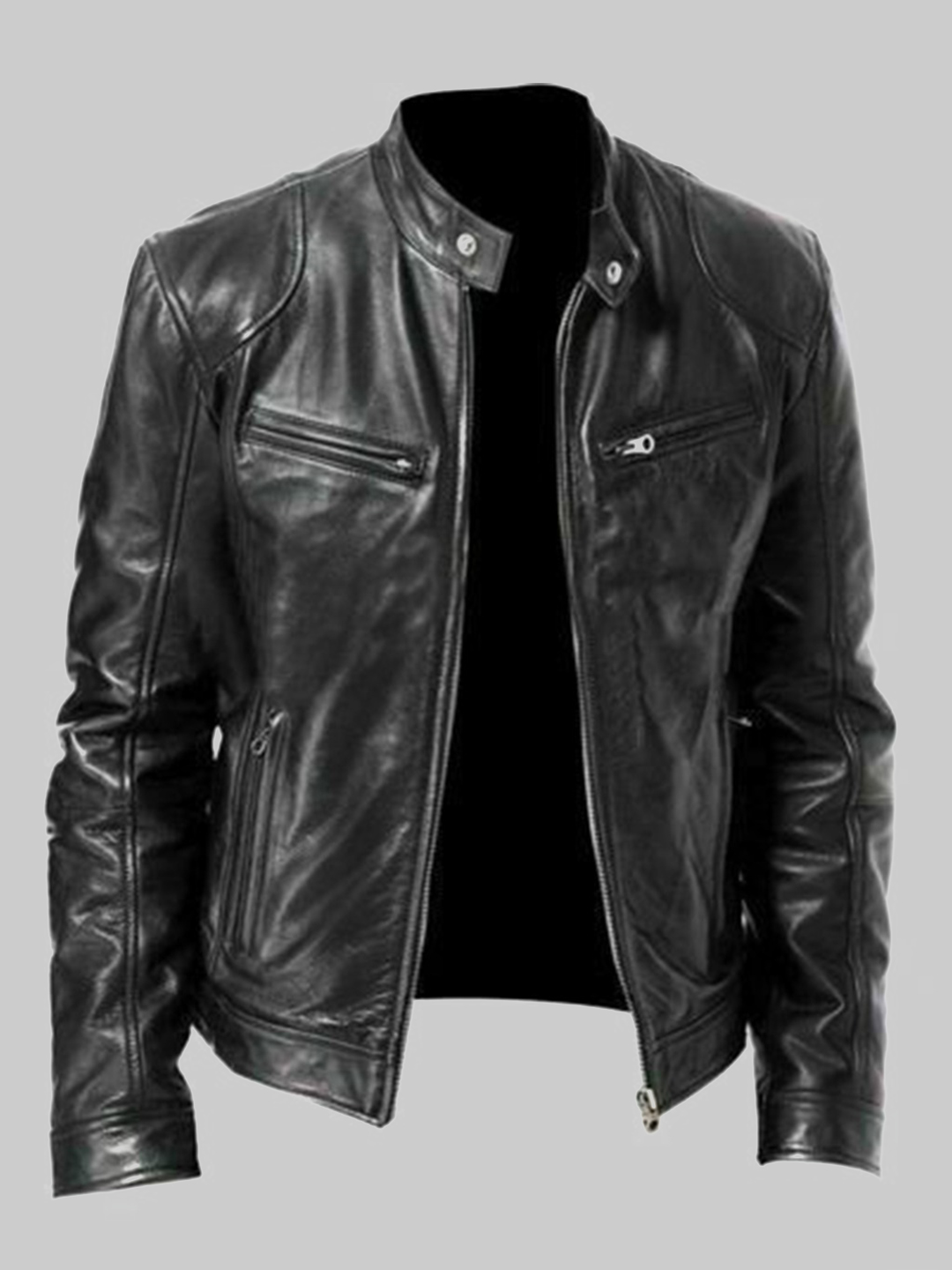 Men’s Classic Black Leather Biker Jacket – Slim Fit with Zippered Accents